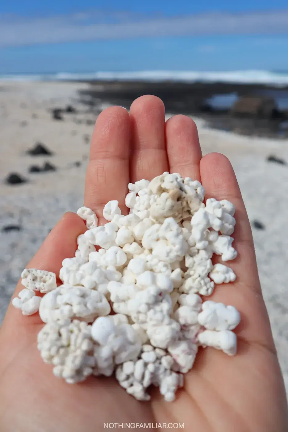 หลายคนอาจคิดว่านี่คือหินธรรมดา แต่จริง ๆ แล้ว “ป๊อปคอร์น” เหล่านี้ไม่ใช่หินแท้ ๆ อย่างที่คิด มันคือซากฟอสซิลของสาหร่ายทะเลสีแดงชนิดหนึ่งที่เรียกว่า โรโดลิธ (Rhodoliths) ซึ่งเติบโตอย่างช้า ๆ ใต้น้ำเป็นเวลานานมาก รูปร่างของมันจะค่อย ๆ กลมขึ้นเรื่อย ๆ คล้ายปะการัง พอถูกคลื่นและกระแสน้ำพัดพาขึ้นมาสะสมบนชายฝั่ง จึงกลายเป็นภาพแปลกตาที่เหมือนชายหาดถูกโรยด้วยข้าวโพดคั่วสีขาวทั่วทั้งพื้นที่
