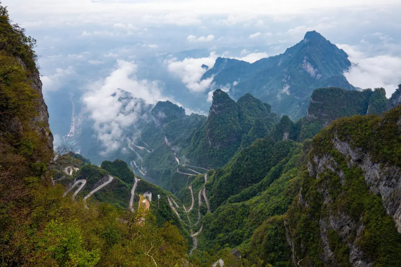 อีกหนึ่งประสบการณ์ที่พลาดไม่ได้คือ กระเช้าลอยฟ้าเทียนเหมินซาน ซึ่งขึ้นชื่อว่าเป็นกระเช้าสำหรับภูเขาที่มีระยะทางยาวที่สุดในโลก ความยาวกว่า 7.5 กิโลเมตร การนั่งกระเช้าค่อย ๆ ลอยผ่านภูเขา ป่า และหุบเขาลึกด้านล่าง เป็นอะไรที่ทั้งตื่นเต้นและงดงามในเวลาเดียวกัน ยิ่งมองลงไปเห็น ถนน 99 โค้ง ที่คดเคี้ยวเหมือนงูเลื้อยอยู่ด้านล่าง ยิ่งทำให้รู้สึกว่าธรรมชาติช่างออกแบบอะไรได้อลังการเหลือเกิน