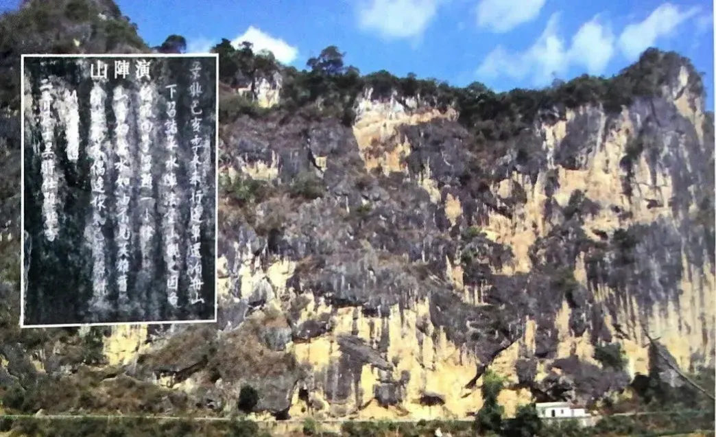 บนหน้าผาสูงกว่า 30 เมตร มีซุ้มหินแบนยื่นออกมา ภายในเป็นศิลาจารึกอักษรจีน 7 แถว ตั้งตรงอย่างประณีต แม้จะถูกกาลเวลากัดกร่อน แต่ยังเห็นลายสลักชัดเจน