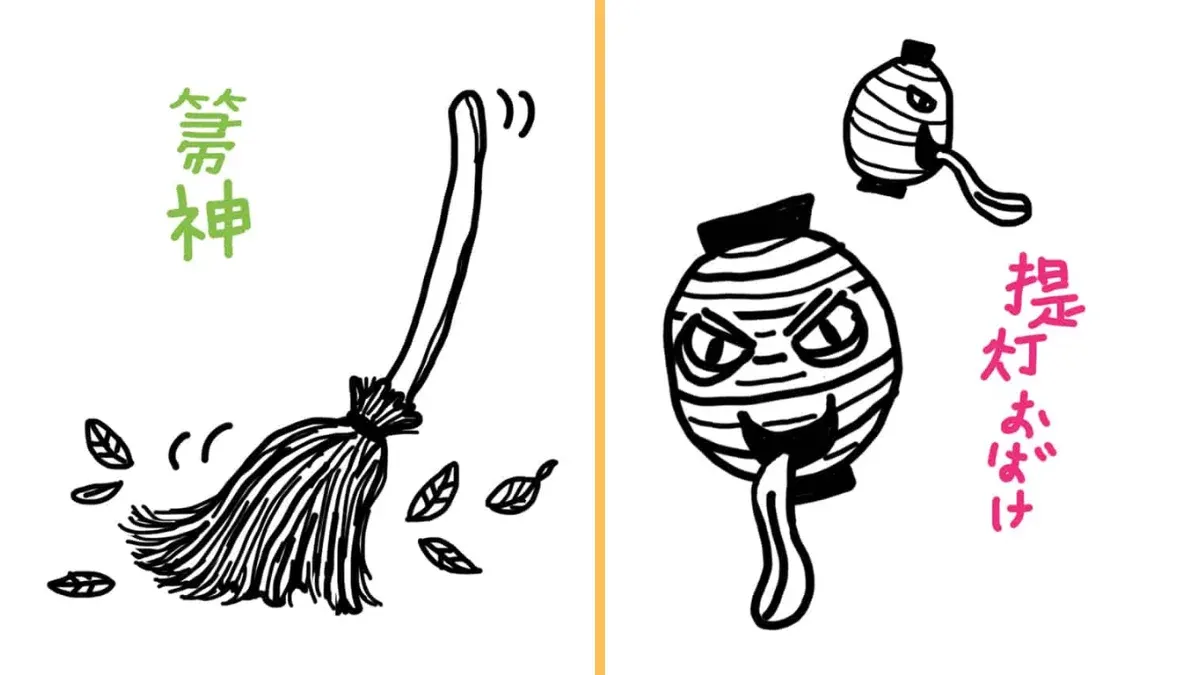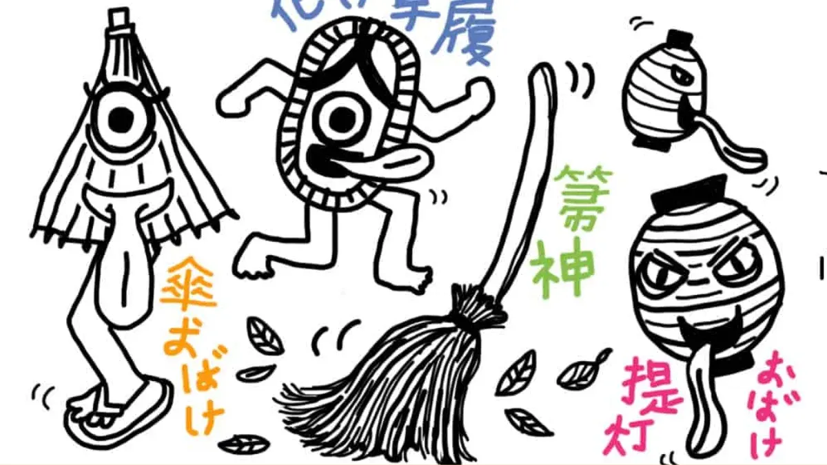1. ผีร่ม (Kasa-obake): พี่ใหญ่ที่เป็นสัญลักษณ์ของผีญี่ปุ่น ต้องเป็นร่มกระดาษโบราณเท่านั้น รูปร่างเด่นคือมีขาเดียว (ที่เป็นด้ามจับ) ใส่รองเท้าเกี๊ยะไม้ มีตาเดียวโต ๆ และแลบลิ้นยาว มักออกมาเคลื่อนไหวในยามค่ำคืนหลังจากวางสงบนิ่งมาตลอดวัน