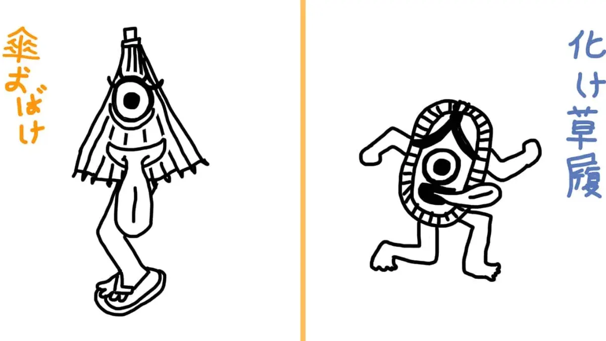 2. ผีรองเท้าฟาง (Bake-zori): วิญญาณที่เกิดจากรองเท้าสานแบบโบราณที่ถูกทิ้งขว้าง พวกมันจะมีแขนขาโผล่ออกมา วิ่งไปรอบบ้านส่งเสียงตึงตังและร้องเพลงอย่างสนุกสนาน เป็นการประชดประชันเจ้าของที่ไม่ยอมเอามันมาสวมใส่ใช้งาน