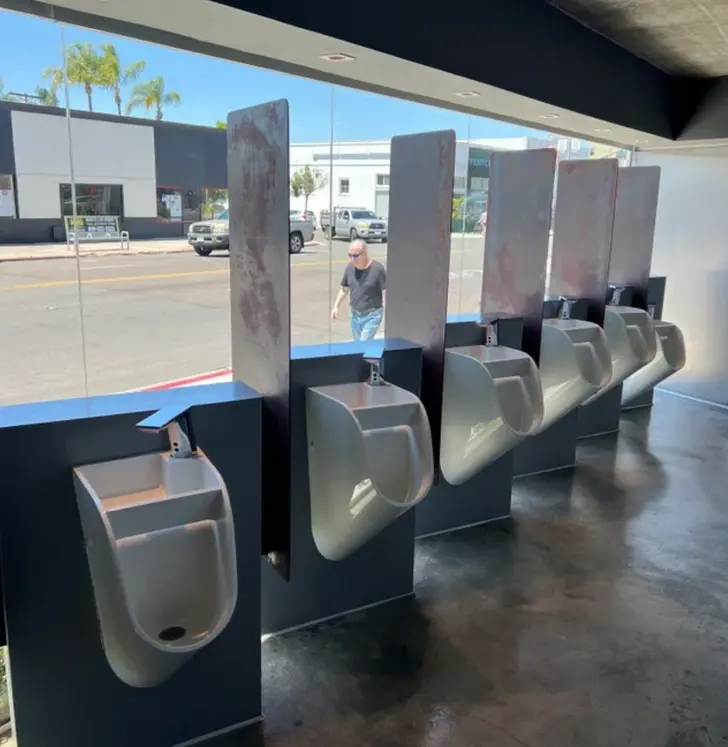 4. ผนังในห้องโถฉี่เหล่านี้สามารถให้คุณมองออกไปที่ถนนได้ เพราะกระจกไม่ได้ติดฟิล์มกรองแสงเลย ดังนั้นคุณจึงสามารถมองเห็นข้างในได้ด้วย!