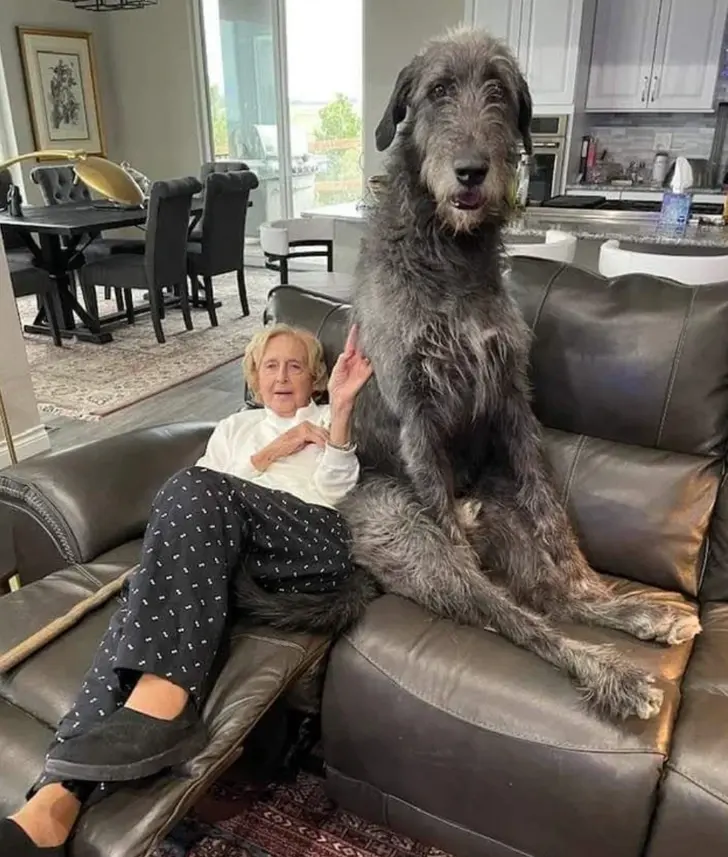 5. ผู้หญิงตัวเล็ก ๆ กำลังนั่งอยู่ข้าง ๆ สุนัขตัวยักษ์ของเธอ