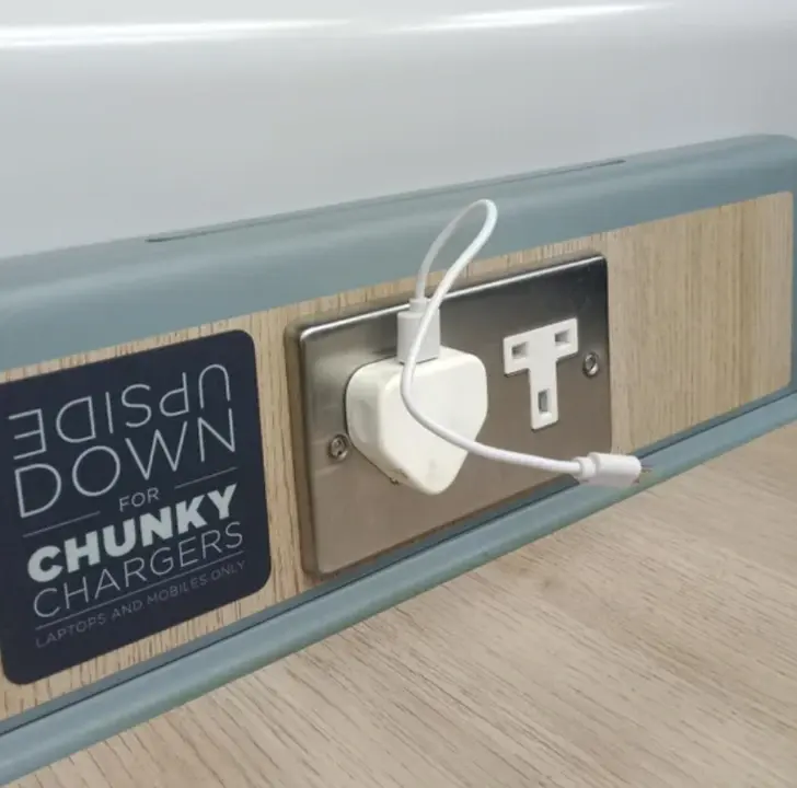 15. นี่เป็นเต้าช่องเสียบที่ชาร์จแบบกลับหัวบนโต๊ะรถไฟที่ป้องกันสายไฟไม่ให้เสียหาย