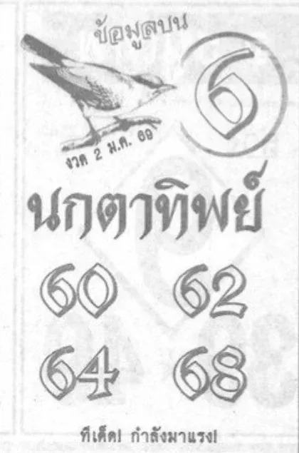 สำหรับบรรดาคอหวย คนรักตัวเลข หรือเซียนหวยทั้งหลาย สำหรับท่านใดที่ยังไม่มีเลขเด็ดโดนใจก็ขอเชิญมารวมตัวกันทางนี้ได้เลย เพราะเรามีแนวทางเลขเด็ดดีๆ จาก "นกตาทิพย์" งวดวันที่ 2 มกราคม 2569 นำมาฝากกัน สำนักใบ้หวยชื่อดังที่อยู่เคียงข้างนักเสี่ยงโชคทั้งหลายมาอย่างยาวนาน