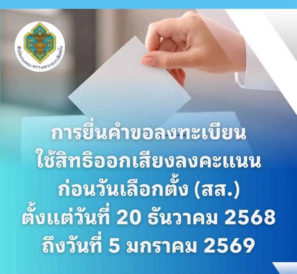 สำคัญ! นักเรียนนักศึกษาที่มาเรียนในเมือง ผู้ที่เข้ามาทำงานในเมือง ถ้าไม่สะดวกกลับไปใช้สิทธิเลือกตั้งตามภูมิลำเนา ต้องลงทะเบียนเลือกตั้งล่วงหน้า หากไม่ลงทะเบียน ใช้สิทธิเลือกตั้งไม่ได้ เริ่ม 20 ธ.ค.- 5 ม.ค. 69