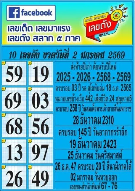 10 เลขเด็ดเลขดัง "สลาก 5 ภาค" งวดวันที่ 2 มกราคม 69..รีบส่องเลย ก่อนหวยหมดแผง!!