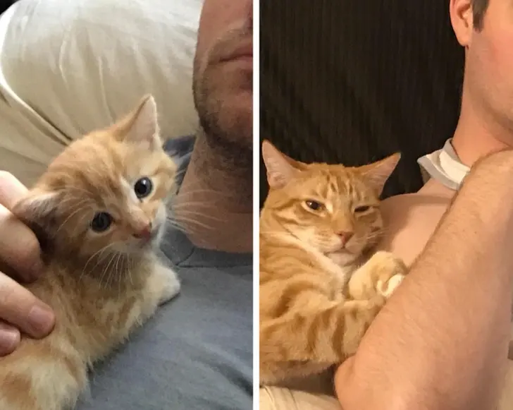 15. สามีของฉันเจอกับแมวของเราตอนที่ยังเป็นลูกแมว ผ่านไปหนึ่งปี เจ้าเหมียวก็ยังชอบนอนบนไหล่ของเขา