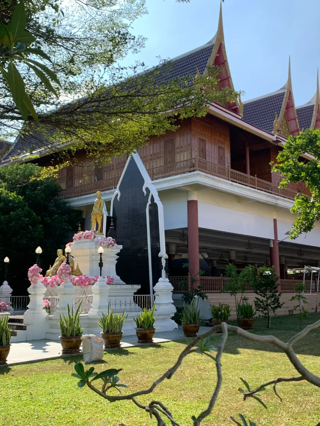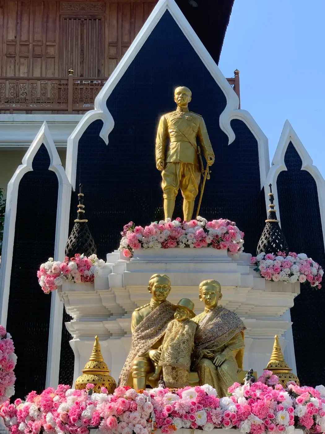 บริเวณด้านหน้ากุฏิของเจ้าอาวาส มีรูปปั้นสีทองของพระบาทสมเด็จพระจุลจอมเกล้าเจ้าอยู่หัว (รัชกาลที่ 5) และสมเด็จพระนางเจ้าสุนันทากุมารีรัตน์ พระบรมราชเทวี และพระราชธิดา ห้อมล้อมไปด้วยดอกกุหลาบสีขาวและสีชมพูสวยงามมากมาย (ดังที่ได้กล่าวไว้ในโพสต์เก่า ดอกกุหลาบสีชมพูเป็นสีโปรดของพระบาทสมเด็จพระจุลจอมเกล้าเจ้าอยู่หัว)