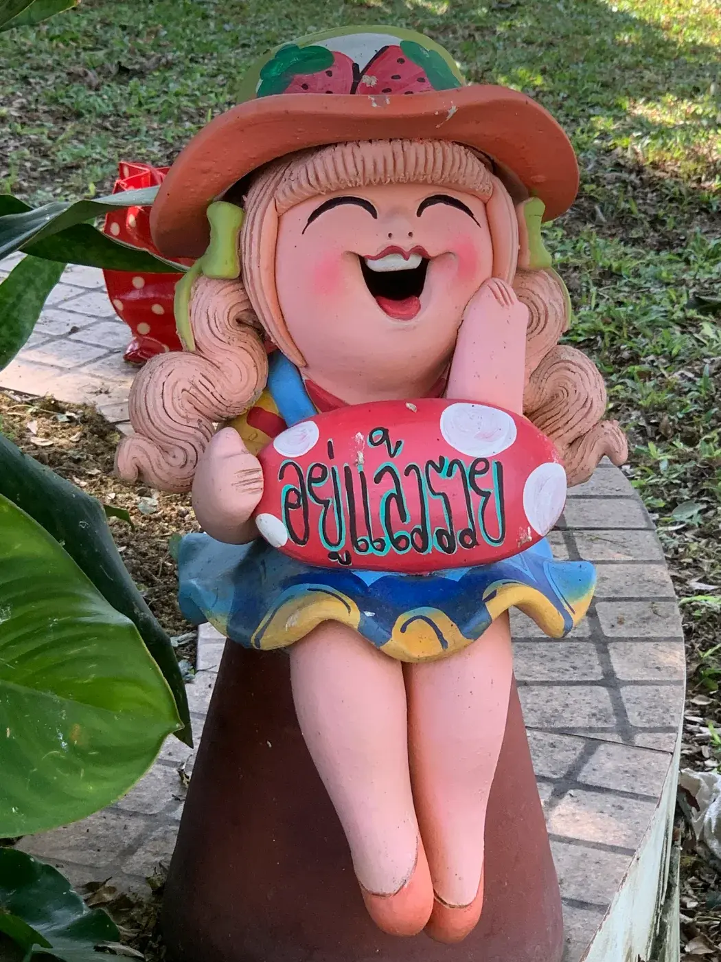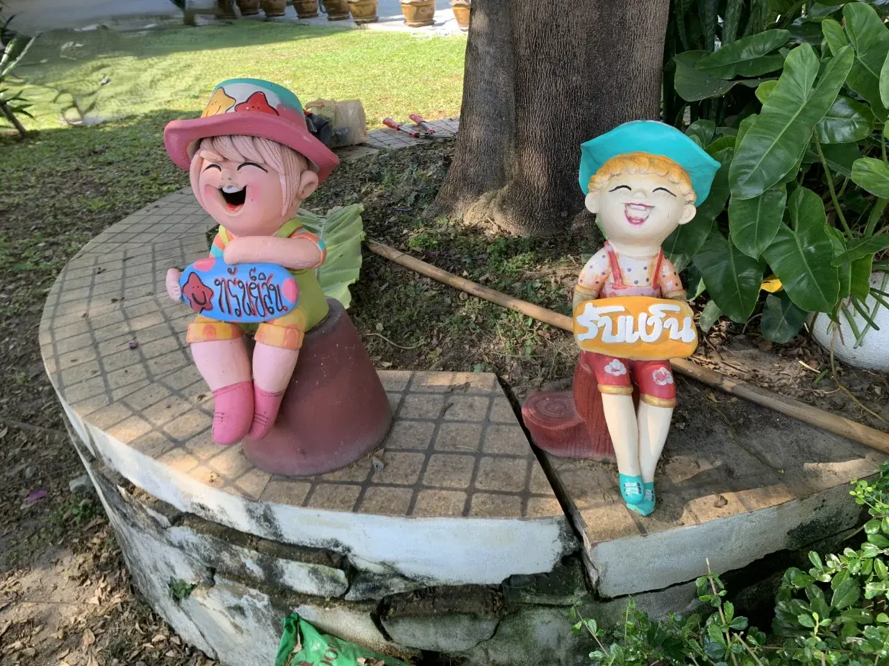 รูปปั้นน่ารักๆ ที่มีคำภาษาไทยที่สื่อความหมายดีๆ เช่น ทรัพย์สิน รับเงิน อยู่แล้วรวย