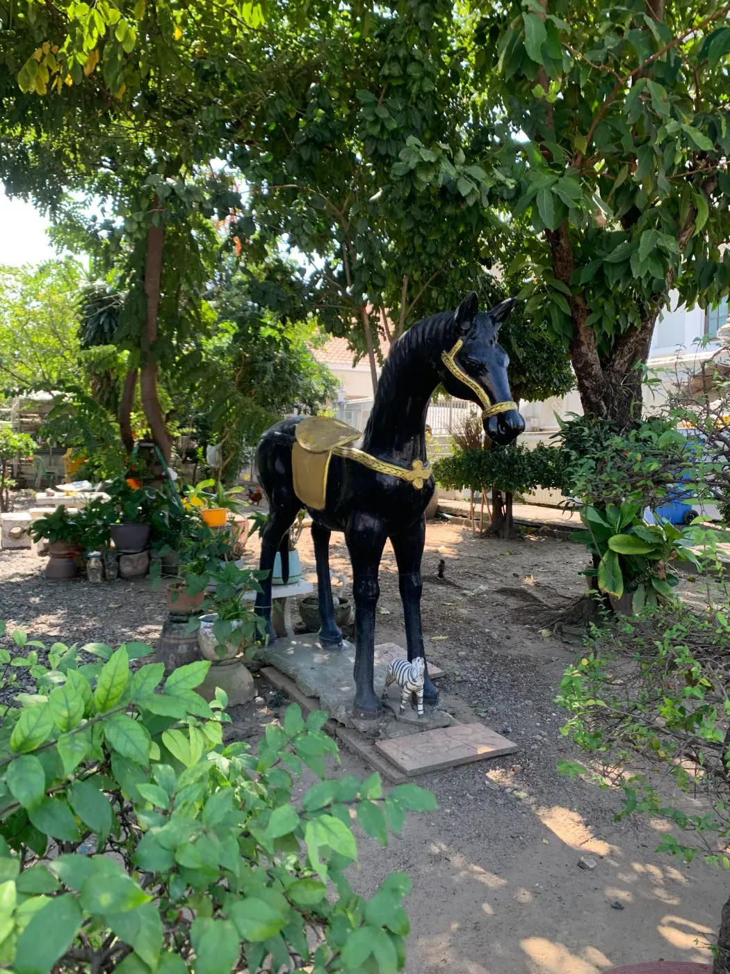 รูปปั้นม้าสีดำขนาดใหญ่และรูปปั้นม้าลายขนาดเล็ก