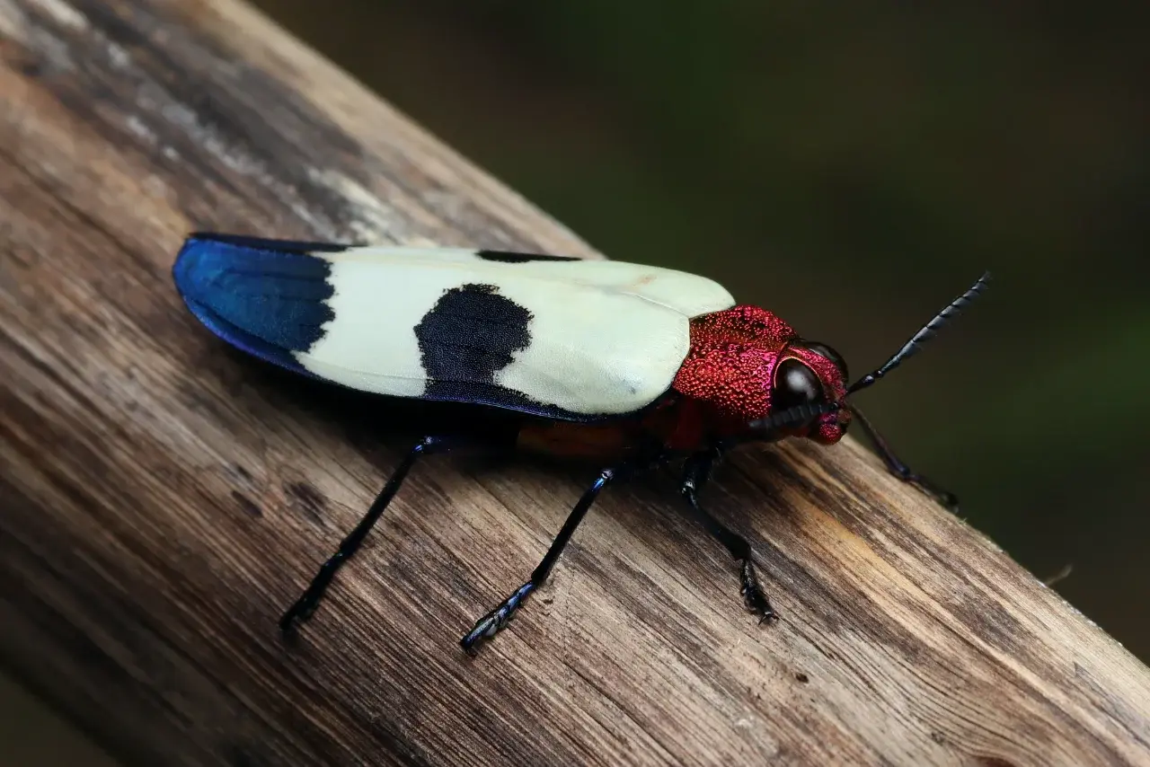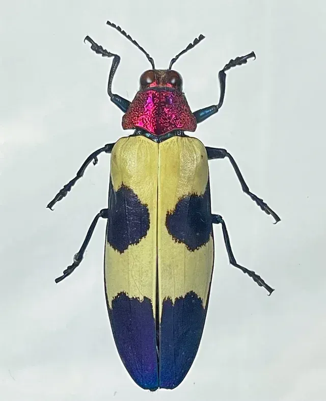 ด้วงชนิดนี้มีชื่อเท่ ๆ ว่า Red Speckled Jewel Beetle หรือชื่อวิทยาศาสตร์ Chrysochroa buqueti rugicollis แค่ชื่อก็บอกแล้วว่ามันไม่ธรรมดา ตัวมันจะเป็นสีเหลืองส้มไปจนถึงสีทอง ดูคล้ายทองคำขัดเงา แล้วมีจุดหรือแถบสีน้ำเงินเข้มแทรกอยู่ตามปีก พอโดนแสงแดดทีนี่นะ… แสงสะท้อนวิบวับจนแทบต้องหรี่ตาดู