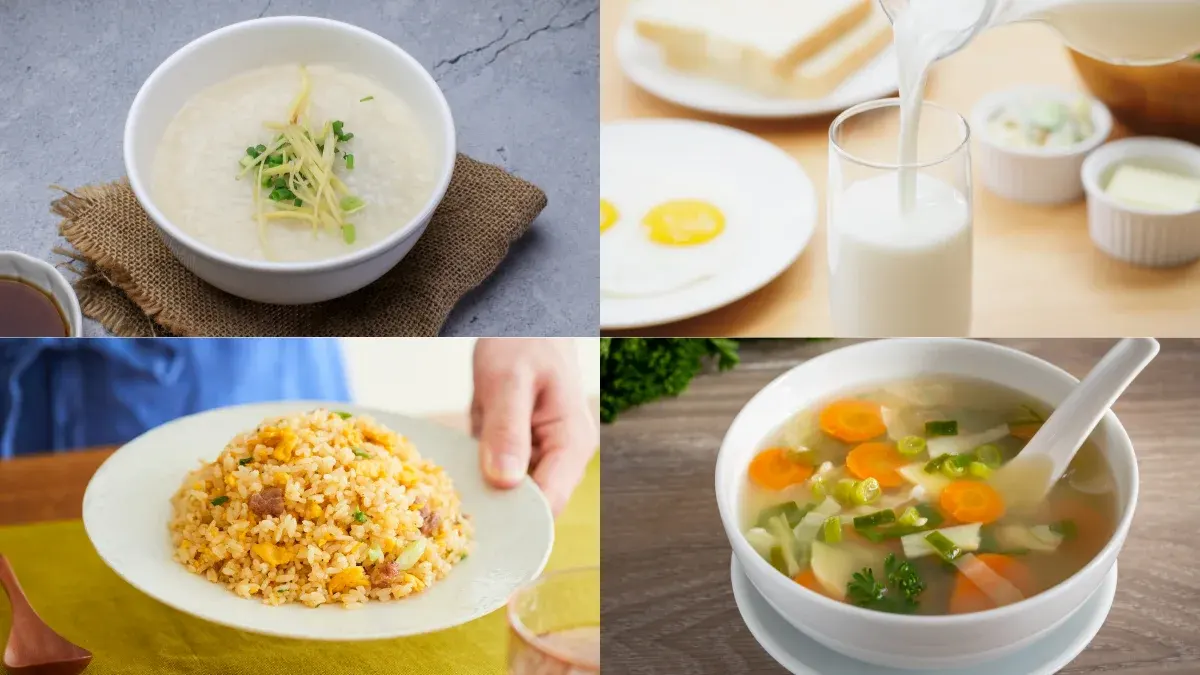 1.โจ๊กไก่ โจ๊กปลา โจ๊กหมูสับ ใส่ไข่ กินคู่กับนม มีคุณค่าอาหารครบถ้วน ย่อยง่ายแต่หนักท้อง ทำให้อิ่มนาน จมูกข้าวอุดมด้วยวิตามินอี และแกมมาออริซานอล ซึ่งเป็นสารแอนตี้ออกซิแดนต์ ได้โปรตีนทั้งจากเนื้อสัตว์และไข่ ขิง ต้นหอม ช่วยชูรสชาติและมีใยอาหาร บวกกับแคลเซียมจากนม ถือเป็นเมนูอาหารที่มีคุณค่าทางโภชนาการสูงเลยทีเดียว
