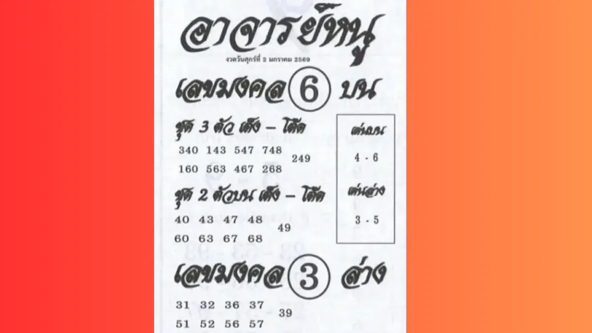 #เลขเด็ด #อาจารย์หนู #นกตาทิพย์ #เจ้าพ่อปากแดง #เจ้าแม่ตะเคียน #หวยงวดนี้ #เลขเด็ด2มกราคา69 #สลากกินแบ่งรัฐบาล #แนวทางหวย