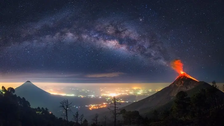 4. ทางช้างเผือกที่ดูเหมือนพุ่งออกมาจากลาวาของภูเขาไฟระเบิด ประเทศกัวเตมาลา