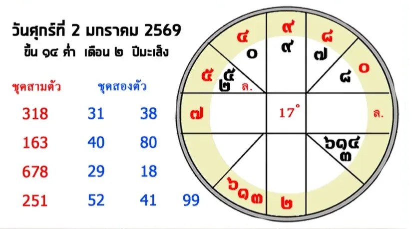 สำหรับหวยงวดที่จะถึงนี้ ก็ออกวันศุกร์ ที่ 2 มกราคม พศ.2569 ซึ่งตรงกับวันขึ้น 14 ค่ำ เดือน 2 ปีมะเส็ง หลังจากการดูการโคจรของดวงดาวต่างๆ แล้ว สามารถที่จะตีเป็นเลขเด็ดได้ดังนี้