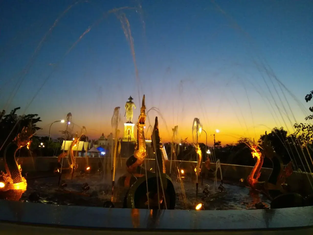 ตรงนี้น่าจะเป็นที่ที่เรานั้นมานั่งในส่วนของน้ำพุที่มีการพุขึ้นมาอย่างไม่ขาดเพราะว่าคนเราจะมานั่งอยู่ในรอบบริเวณนี้ เราจะเห็นว่าในส่วนของสัตว์ที่อยู่ในสถานที่ของน้ำที่ มีการสร้างเหมือนกันกับว่ามีการเล่นน้ำของพญานาคที่กำลังส่องแสงไฟออกมา หากว่าคืนเดือนมืดนั้นทำให้สถานที่แห่งนี้นั้นจะมีแสงสว่างเหมือนว่าเหลืองทองสวยงามมาก
