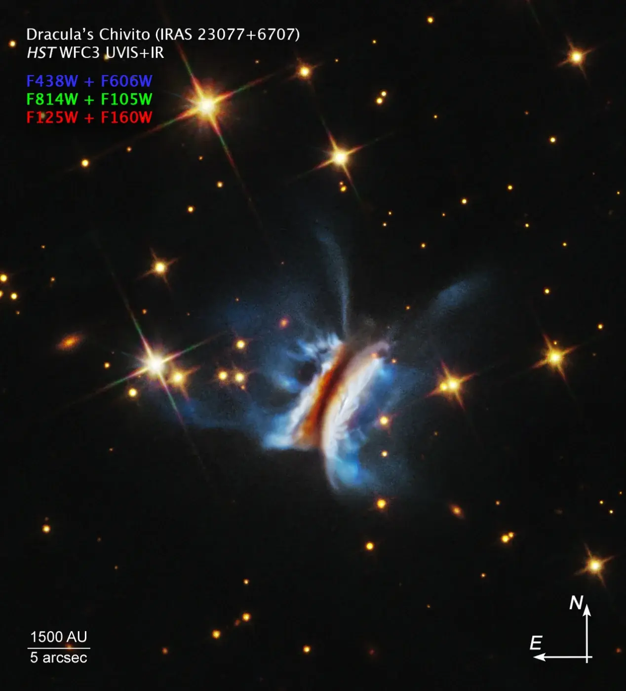 จานก่อกำเนิดดาวเคราะห์นี้มีรหัสทางวิทยาศาสตร์ว่า IRAS 23077+6707 ตั้งอยู่ห่างจากโลกประมาณ 1,000 ปีแสง ความน่าทึ่งของมันอยู่ที่ขนาดซึ่งแผ่ขยายออกไปกว้างไกลถึง 400,000 ล้านไมล์ (6.437 แสนล้านกิโลเมตร) หรือหากเทียบให้เห็นภาพคือมันมีเส้นผ่านศูนย์กลางใหญ่กว่าระบบสุริยะของเรา (นับไปจนถึงแถบไคเปอร์) ถึง 40 เท่า
