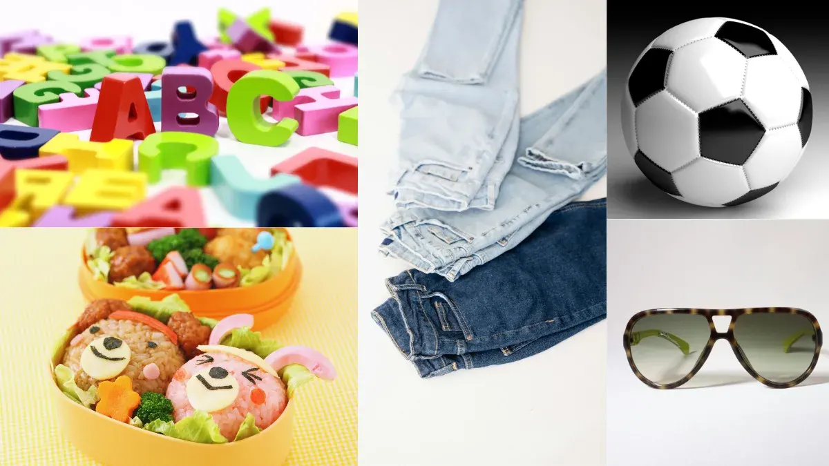 - ตัวอักษร B: ขนมปัง (Bread) กระเป๋า (Bag) ลูกบอล (Ball)
