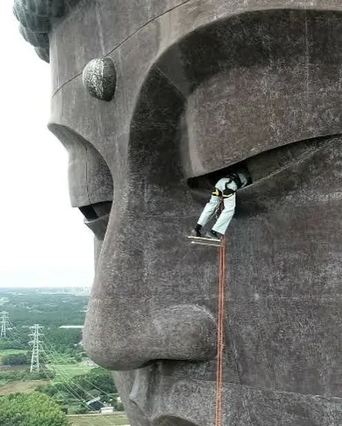 ภาพของเจ้าหน้าที่ซ่อมบำรุงหรือทีมทำความสะอาด ที่กำลังปฏิบัติงานบริเวณ "ดวงตา" ขององค์พระพุทธรูปอุชิคุ ไดบุตสึ