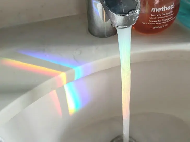 4. การหักเหของสายรุ้งจากประตูห้องน้ำกระจกของฉัน บังเอิญอยู่ในระนาบเดียวกันอย่างพอดีกับน้ำที่ไหลออกมาจากก๊อก