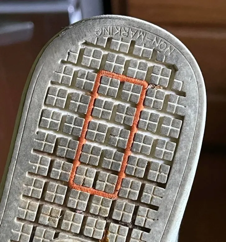 7. ยางรัดผมเส้นนี้ติดอยู่ในร่องพื้นรองเท้าของฉันแบบพอดี