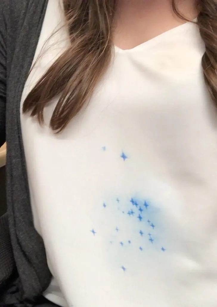 23. น้ำหมึกจากตัวแสตมป์วันที่จากที่ทำงานกระเด็นใส่เสื้อเชิ้ตของฉัน และมันก็กลายเป็นดวงดาวดวงเล็ก ๆ