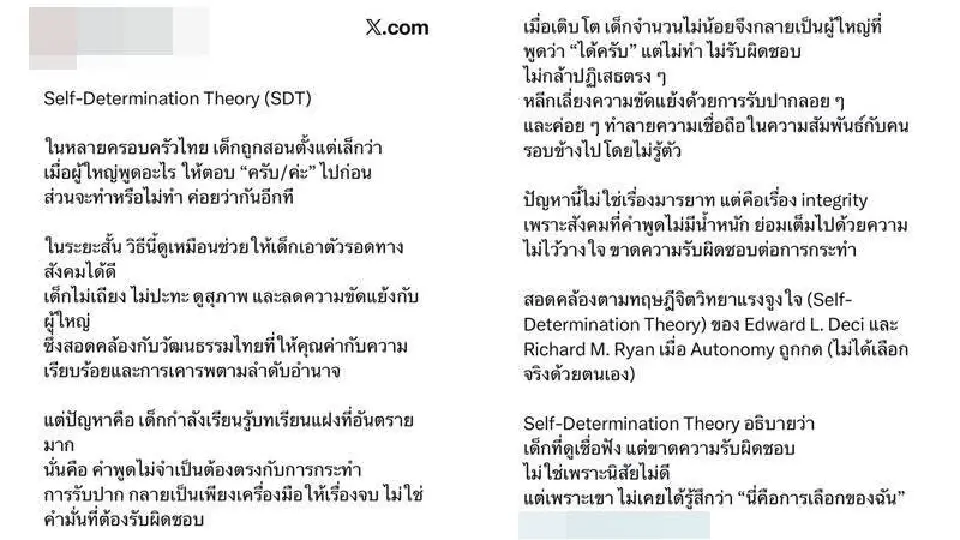 หลังจากคลิปถูกแชร์ นักวิชาการได้วิจารณ์เกี่ยวกับการเลี้ยงเด็ก โดยชี้ว่าการสอนให้เด็กพูด “ครับ/ค่ะ” ก่อนอาจช่วยให้เด็กเอาตัวรอดในสังคมได้ แต่ก็มีความกังวลว่าเด็กอาจเรียนรู้ว่าคำพูดไม่จำเป็นต้องตรงกับการกระทำ ซึ่งอาจทำให้โตขึ้นเป็นผู้ใหญ่ที่ไม่กล้าปฏิเสธและหลีกเลี่ยงความขัดแย้ง โดยไม่รู้ตัวว่าบ่อนทำลายความน่าเชื่อถือในความสัมพันธ์กับคนรอบข้าง
