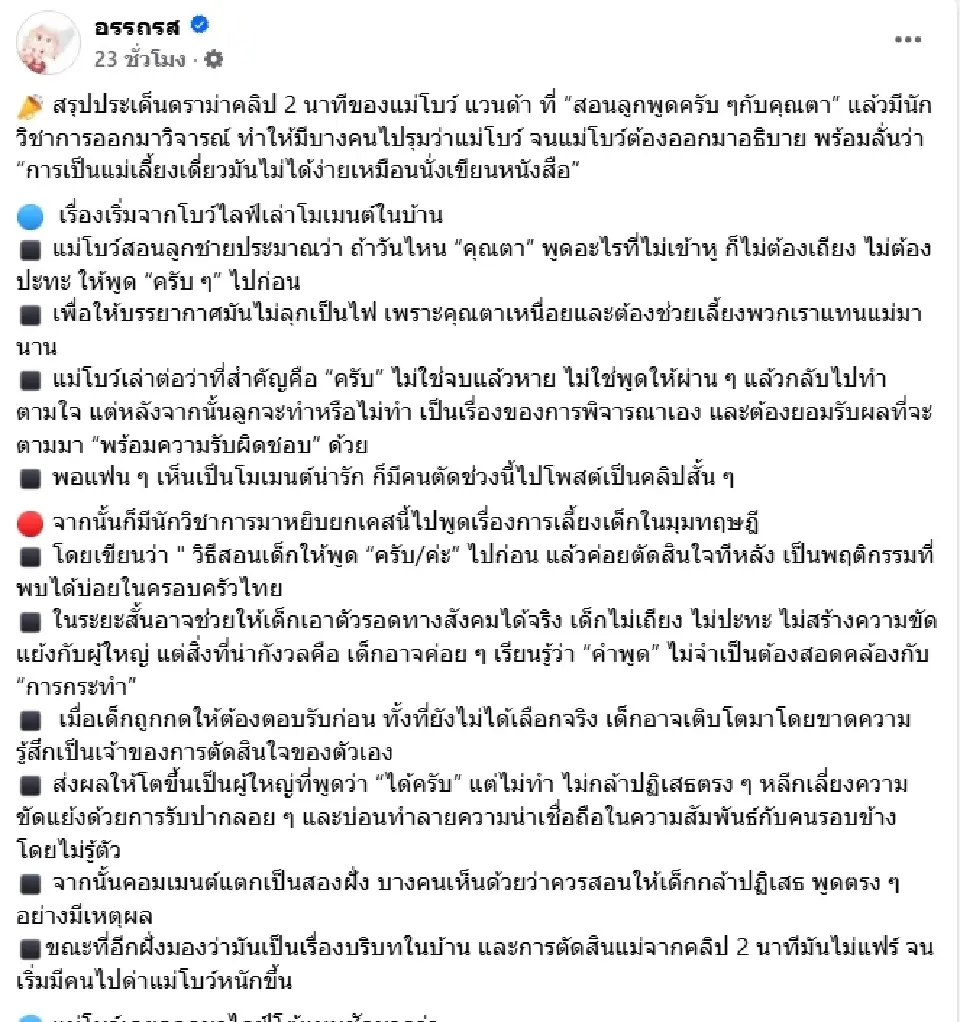 แม่โบว์สอนลูกในคลิป 2 นาที ถูกนักวิชาการวิจารณ์ ทำให้โซเชียลแบ่งเป็นสองฝ่าย ก่อนแม่โบว์ชี้แจงว่าเลี้ยงลูกไม่ใช่การท่องตำรา คลิปนี้กลายเป็นประเด็นร้อนเมื่อแม่โบว์สอนลูกชายให้พูด “ครับ ๆ” กับคุณตาเมื่อมีการพูดที่ไม่เข้าหู โดยไม่ต้องเถียง เพื่อไม่ให้บรรยากาศตึงเครียด แม่โบว์ย้ำว่าคำว่า “ครับ” ไม่ใช่แค่การตอบผ่าน ๆ แต่ลูกต้องพิจารณาผลที่ตามมาด้วย