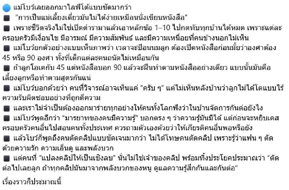แม่โบว์จึงไลฟ์ตอบว่า “การเป็นแม่เลี้ยงเดี่ยวไม่ง่ายเหมือนเขียนหนังสือ” เพราะชีวิตจริงไม่สามารถใช้ตำราได้ทุกบ้าน แต่ละครอบครัวมีเงื่อนไขและความเหนื่อยที่คนข้างนอกไม่เห็น แม่โบว์ยกตัวอย่างว่าเวลาป้อนนมลูก ไม่ต้องเปิดหนังสือดูองศา เพราะเด็กแต่ละคนไม่เหมือนกัน ถ้าลูกโอเคกับ 45 องศา แต่หนังสือบอก 90 องศา จะทำตามหนังสืออย่างเดียวได้อย่างไร แม่โบว์บอกว่าคนที่วิจารณ์อาจเห็นแค่ “ครับ ๆ” แต่ไม่เห็นว่าลูกไม่ได้โตแบบไร้ความรับผิดชอบ และไม่จำเป็นต้องบอกทุกอย่างให้คนทั้งโลกฟัง