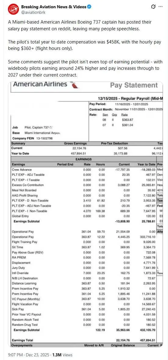 เมื่อไม่นานมานี้ สลิปเงินเดือนของนักบินสายการบินชาวอเมริกันคนหนึ่งได้ปรากฏบนแพลตฟอร์มโซเชียลมีเดีย X (เดิมคือ Twitter) ทำให้เกิดความสนใจและการถกเถียงกันอย่างกว้างขวาง โดยกัปตันที่ประจำอยู่ในไมอามีซึ่งขับเครื่องบินโบอิ้ง 737 ได้เปิดเผยรายได้ต่อปีของเขาที่ 458,000 ดอลลาร์สหรัฐ หรือประมาณ 14.46 ล้านบาท