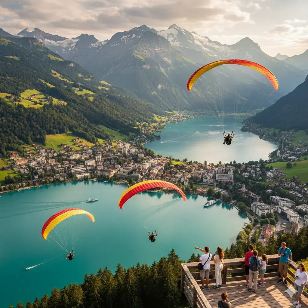 สำหรับผู้ที่ชื่นชอบกิจกรรมกลางแจ้ง อินเทอร์ลาเคินคือสวรรค์ที่ตอบโจทย์ความท้าทายทุกรูปแบบ จากใจกลางเมืองจะเห็นร่มชูชีพสีสันสดใสมากมายลอยละล่องอยู่เหนือท้องฟ้า นี่คือภาพจำของการทำ พาราไกลดิ้ง (Paragliding) ซึ่งเป็นวิธีที่ดีที่สุดในการชื่นชมทิวทัศน์อันยิ่งใหญ่ของเมืองและทะเลสาบจากเบื้องบน