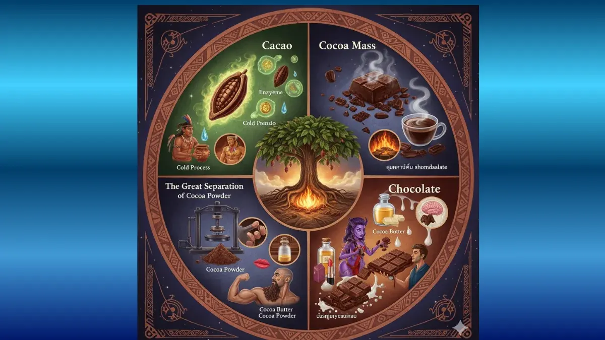 บทที่ 2: The Great Separation การหย่าร้างของ Cocoa Powder ในอุตสาหกรรมเครื่องดื่ม ไขมันที่สูงเกินไปทำให้ละลายน้ำยาก มนุษย์จึงใช้เครื่องจักรบีบอัด Cocoa Mass เพื่อแยกทางออกจากกัน สิ่งที่ไหลออกมาคือ "Cocoa Butter" สีทองล้ำค่าที่ถูกส่งไปทำเครื่องสำอางและไวท์ช็อกโกแลต ส่วนกากแห้งที่เหลือจะถูกนำมาป่นเป็น "Cocoa Powder" หรือผงโกโก้ที่เรารู้จักกันดี ซึ่งเป็นร่างที่มีไขมันต่ำแต่เข้มข้นด้วยรสชาติและสารอาหารมากที่สุด