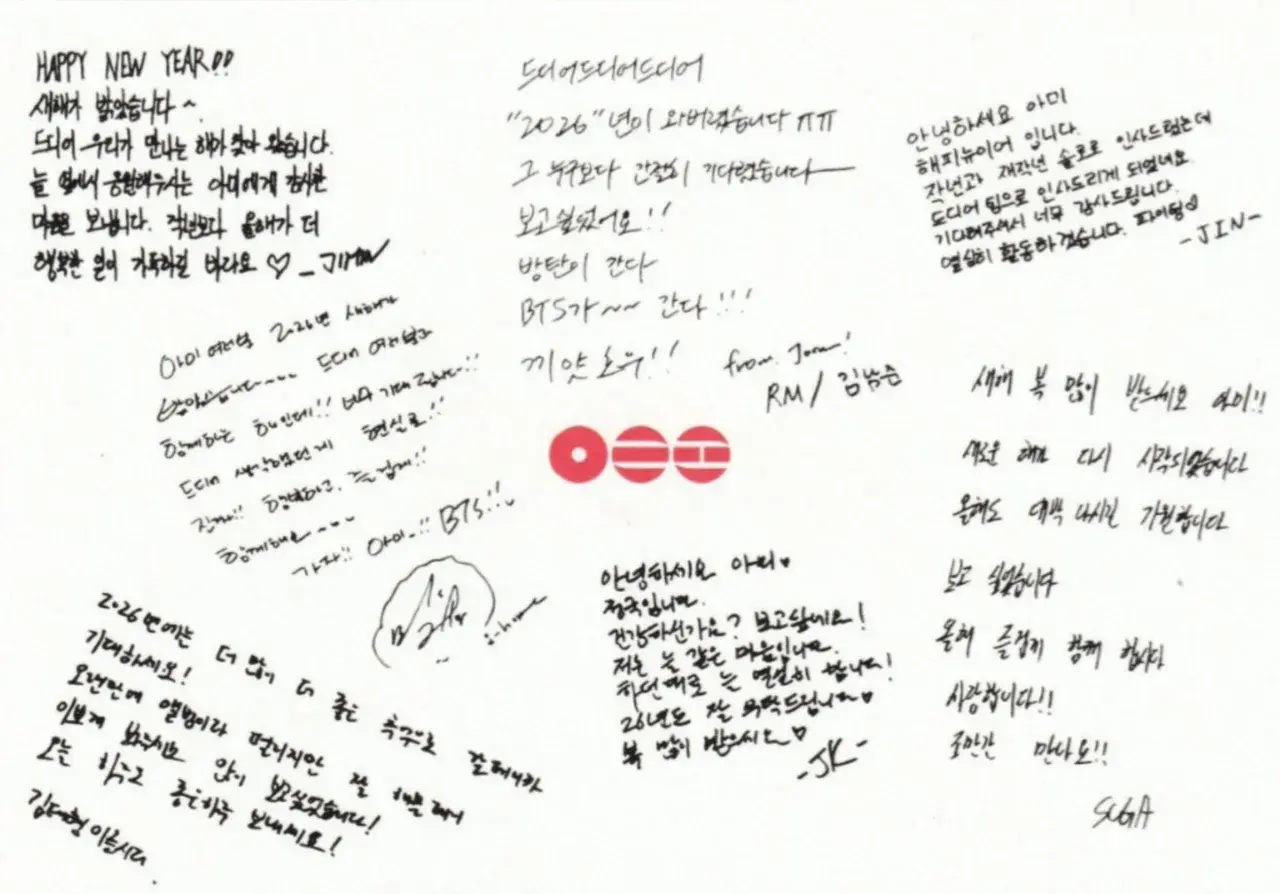 J-HOPE : อาร์มี่! ปีใหม่ 2026 ได้เริ่มต้นขึ้นแล้ว ในที่สุดปีนี้เราก็จะได้อยู่ด้วยกัน!!! ผมตื่นเต้นมากครับ สิ่งที่ผมจินตนาการไว้กำลังจะกลายเป็นความจริงแล้ว!! จริงๆ นะ!!! มามีความสุขและสนุกไปด้วยกัน!! ไปเลย!! ลุย!! อาร์มี่!! BTS!!