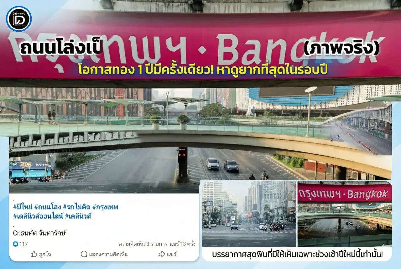 จากภาพ บรรยากาศวันนี้ (1 ม.ค. 69) ถนนโล่งจนแทบจะลงไปวิ่งเล่นได้ ไร้เสียงแตร ไร้ควันพิษ เป็นบรรยากาศที่หาดูได้ยากระดับ Rare Item ที่ 1 ปีจะมีให้เห็นแค่ช่วงสั้นๆ เท่านั้นครับ