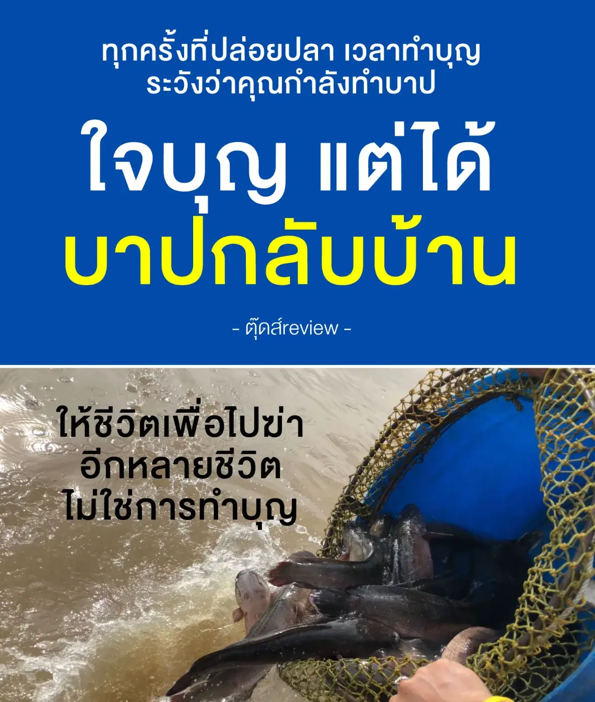 ทุกครั้งที่ปล่อยปลา เวลาทำบุญ ระวังว่าคุณกำลังทำบาป ใจบุญ แต่ได้บาปกลับบ้าน "ให้ชีวิต เพื่อไปฆ่าอีกหลายชีวิต ไม่ใช่การทำบุญ"