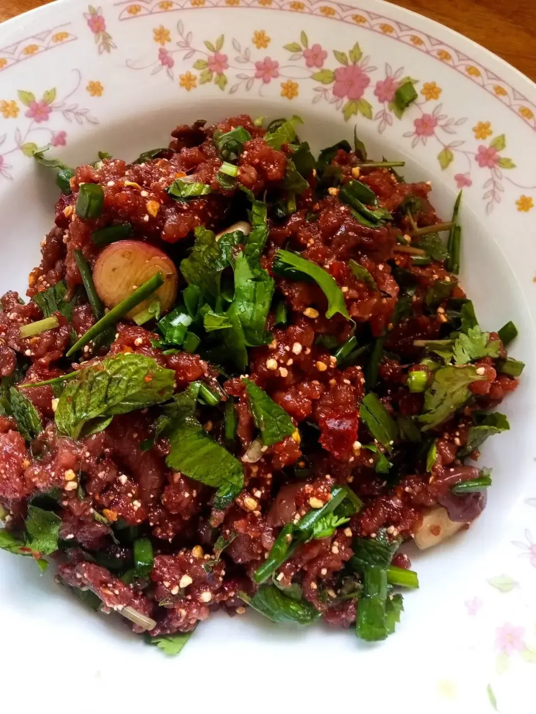 สิ่งมี่นำมาทำอาหารจะมีเนื้อวัวสด หั่นเป็นชิ้นเล็กๆ ใส่หอมแดงเพื่อที่จะเพิ่มความหอม ใส่สาระแหน่หอมใส่เยอะกระเทียมช่วยทำให้ความคาวนั้นหายไป 🍚 ข้าวคั่วเองมำให้ลายนั้นหอมไม่คาวอีกต่อไป