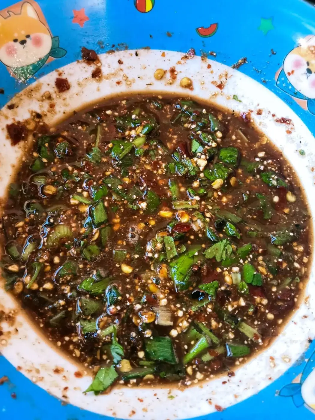 แน่นอนว่าในการกินอาหารที่เป็นเนื้อวัว เราจะต้องมีในส่วนของน้ำจิ้มที่จะมีพริก หอมและผักชีลาว ต่อด้วยข้าวคั่วที่มีการตำละเอียด น้ำพริกนั้นหอม การปรุงนั้น