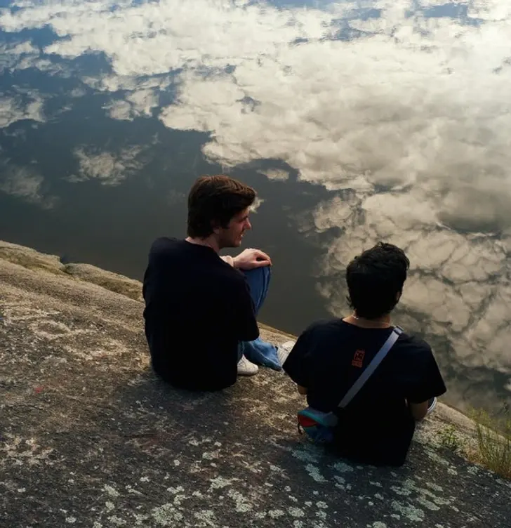 5. เพื่อน ๆ ของฉันนั่งอยู่บนตลิ่งที่มีเงาของท้องฟ้าสะท้อนในแม่น้ำ จนดูเหมือนนั่งอยู่บนผาที่สูง