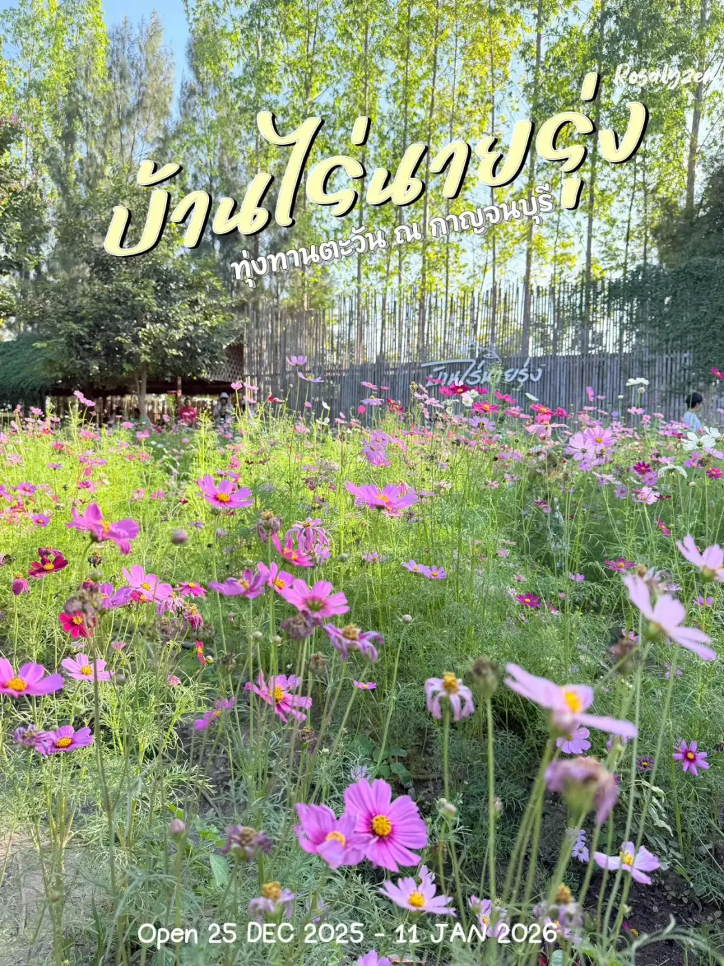 จุดถ่ายรูปกับดอกคอสมอส นอกจากทานตะวันแล้ว ยังมีดอกคอสมอสด้วยนะ กับคำว่าบ้านไร่นายรุ่ง สวยอยู่นะ เป็นป้านด้านหน้าทางเข้าเลย คนถ่ายรูปเช็คอินเยอะอยู่นะ