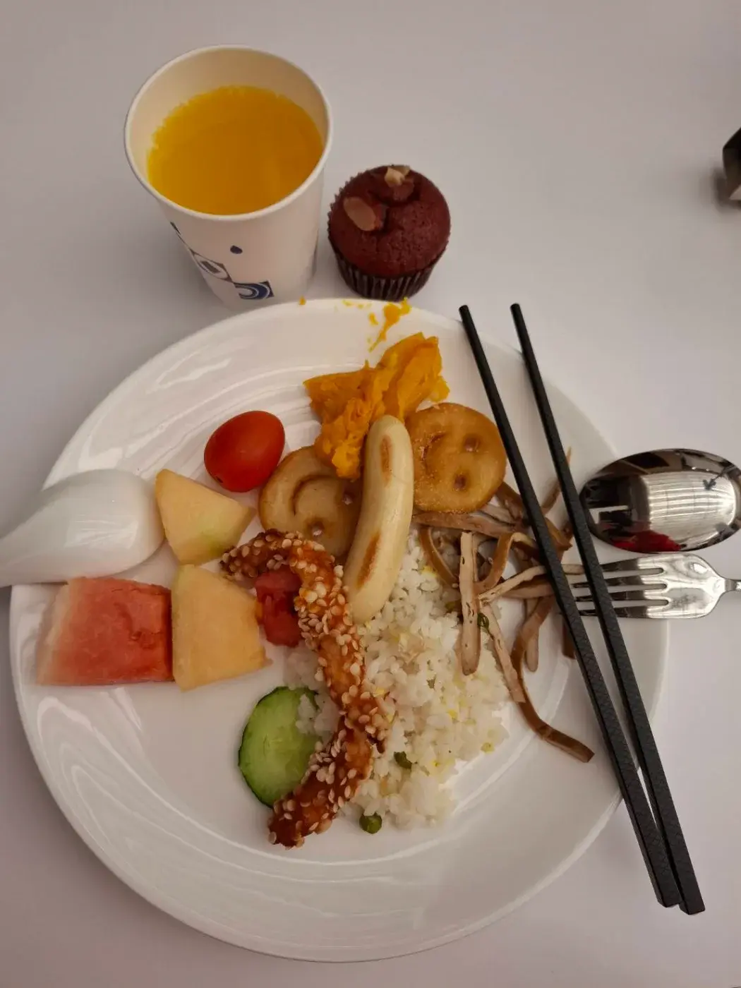 รับประทานอาหารเช้าที่โรงแรมก่อนออกเดินทางไปเมืองอู่หลง อาหารเช้าเรียบง่ายแต่รสชาติดี สะอาด น้ำส้มก็อร่อย (กลมๆ ยิ้มๆ นั่นคือ มันฝรั่ง)