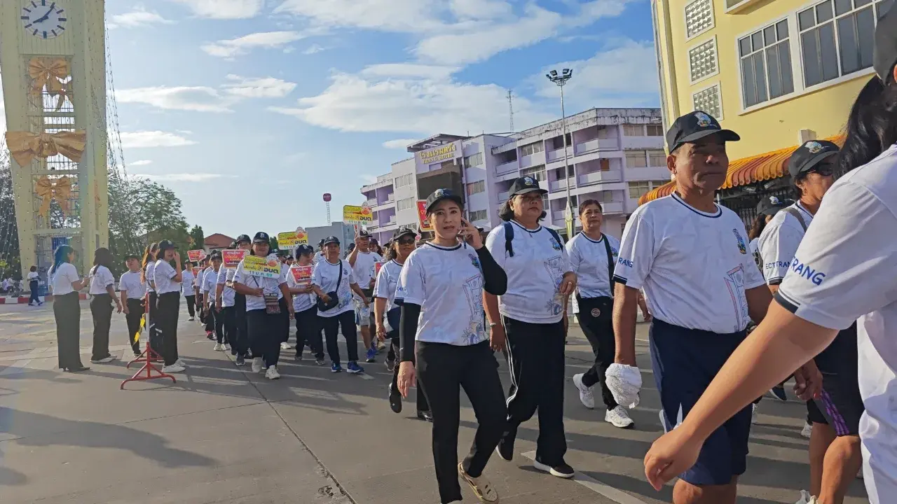 จากนั้นประธานได้กดแตรลมปล่อยขบวนเดินรณรงค์ โดยมีรถไฟฟ้าเทศบาลนครตรังนำขบวน ตามด้วยรถแห่จำนวน 1 คัน ขบวนเยาวชนและประชาชนถือป้ายรณรงค์ กลุ่ม LGBTQ+ แต่งชุดสวยงาม กลุ่มผู้พิการนั่งวีลแชร์ พร้อมมาสคอตพะยูนน้อยจำนวน 2 ตัว ต่อด้วยวงโยธวาทิตจากโรงเรียนวัดควนวิเศษมูลนิธิ ประชาชนทั่วไป และรถตุ๊กๆหัวกบจำนวน 20 คัน ปิดท้ายด้วยรถพยาบาล โดยมีผู้เข้าร่วมกิจกรรมรวมกว่า 600 คน สร้างสีสันและความสนใจให้กับประชาชนตลอดเส้นทาง