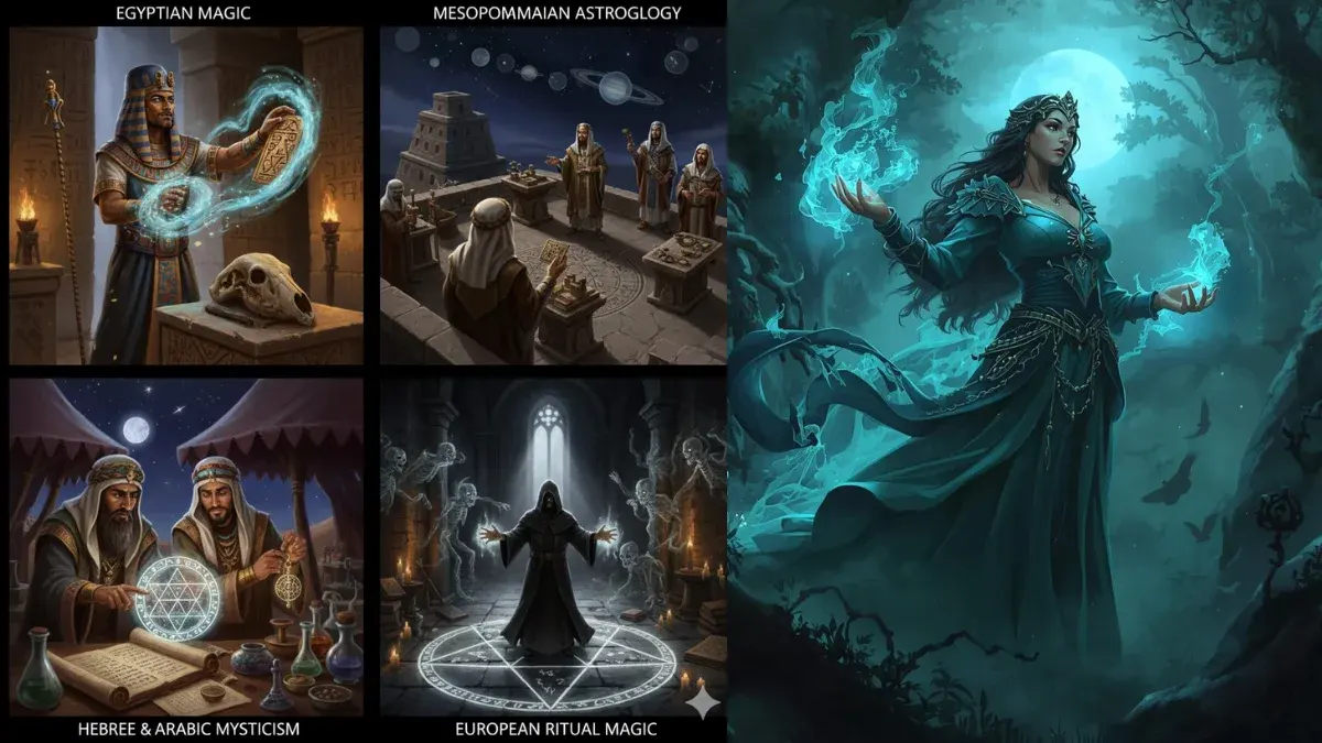 3. ฮีบรูและอาหรับ: พลังแห่งนามศักดิ์สิทธิ์และดวงดาว ในโลกของชาวฮีบรู ความลับอยู่ที่ "ชื่อที่แท้จริง" ของพระเจ้าและเทวทูต ซึ่งเชื่อว่ามีพลังมหาศาลหากใครล่วงรู้ ส่วนในโลกอาหรับ เวทมนตร์ได้ผูกโยงเข้ากับดาราศาสตร์และคณิตศาสตร์ จนเกิดเป็นแนวคิดเรื่อง "ทาลิสแมน" (Talisman) หรือเครื่องรางที่ดึงพลังจากดวงดาว ซึ่งความรู้เหล่านี้ถูกส่งต่อไปยังยุโรปในเวลาต่อมา