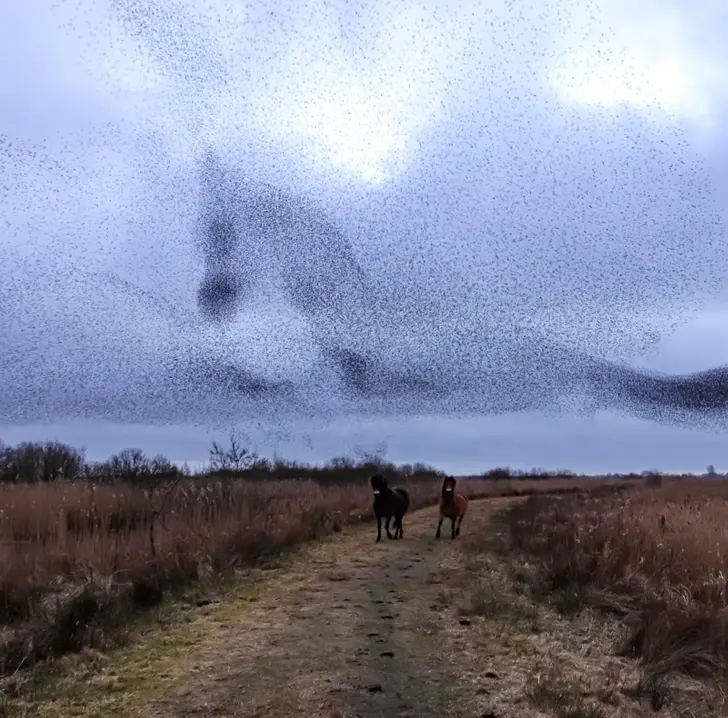 3. ฝูงนกรวมตัวกันเป็นรูปร่างคล้ายม้า ในขณะที่มีม้าควบอยู่ในฉากหลัง