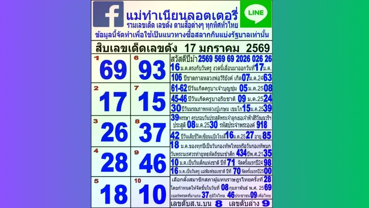 ส่องสถิติ 10 เลขดังมาแรง "แม่ทำเนียน" งวดรับวันครู 17 มกราคม 2569