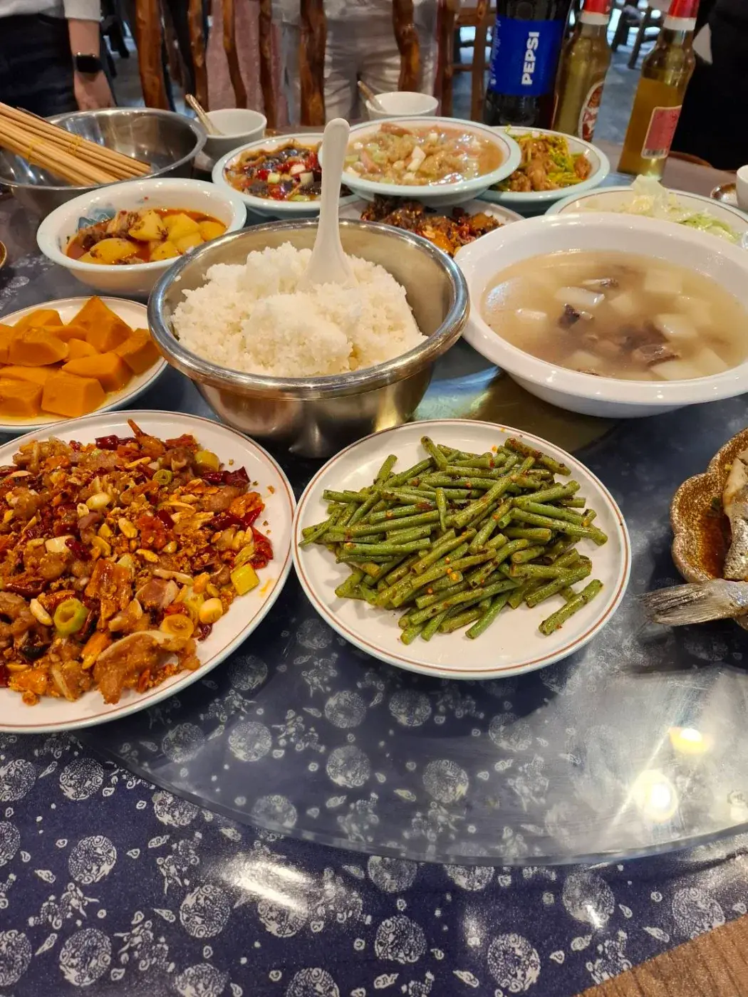 หลังจากเหนื่อยกับการเดิน จึงหลับปุ๋ยหลุยตามระเบียบบนเตียงอุ่นๆ ตื่นมารับประทานอาหารเช้าที่โรงแรม ที่นี่โดยรวมเป็นอาหารพื้นเมืองเรียบง่าย เน้น ผัก เผือก มัน ธัญญพืช น้ำเต้าหู้อร่อย น้ำส้มอร่อย โรงแรมเขาออกแบบมาสวยดี เพ่งมาเห็นชัดๆ ก็ตอนเช้า เพราะตอนกลางคืน มืดและเงียบมากๆ