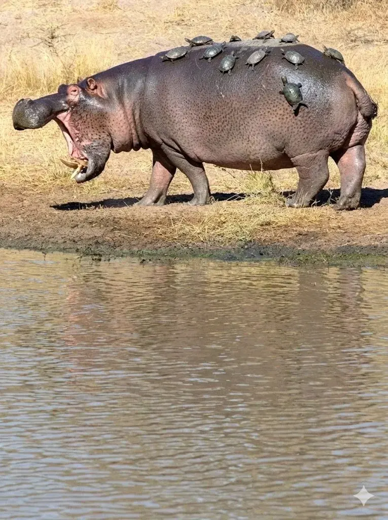 ถ้ามองด้วยสายตาคนทั่วไป มันคือภาพน่ารักมาก เต่าหลายตัวปีนขึ้นหลังฮิปโปเหมือนขึ้นเกาะเล็ก ๆ กลางน้ำ บ้างก็นอนเหยียด บ้างก็นั่งนิ่ง ๆ อาบแดดเหมือนนักท่องเที่ยวริมทะเล ส่วนฮิปโปก็ยังคงทำหน้าตาเฉยเมย เหมือนไม่ได้รู้สึกรู้สาอะไรกับการที่มี “ผู้โดยสาร” เต็มหลังขนาดนั้นเลย