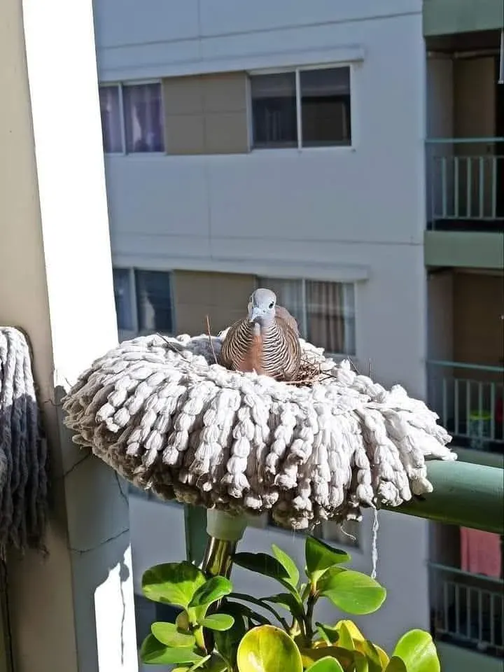 ปกติเราจะคุ้นชินกับภาพรังนกบนต้นไม้ บนกิ่งไม้ หรือในพุ่มไม้ใช่ไหม แต่รอบนี้เจ้าตัวนี้เลือก “หัวม็อบถูพื้น” ที่วางตากอยู่ริมระเบียงคอนโดหรือหอพักแทน ฟังดูเหมือนเรื่องตลก แต่พอดูดี ๆ มันก็สมเหตุสมผลแบบแปลก ๆ นะ หัวม็อบมันนุ่ม กลม มีรูปทรงคล้ายรังนกตามธรรมชาติ แถมยังวางนิ่ง ๆ ไม่กลิ้งไปไหนง่าย ๆ อีกต่างหาก เหมือนนกเขาชวาเจออสังหาริมทรัพย์ทำเลทองโดยบังเอิญ