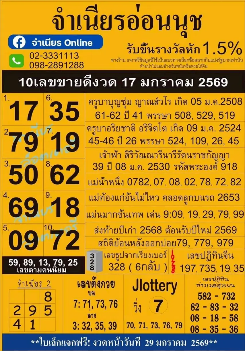 10 เลขขายดี "จำเนียรอ่อนนุช" งวดวันที่ 17 มกราคม 69 มาแล้ว!..คอหวยส่องด่วน!!