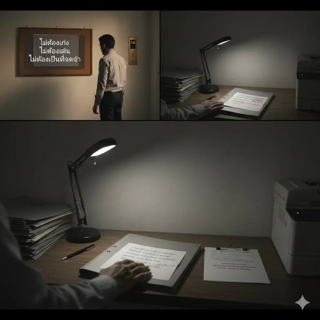 เสียงเครื่องถ่ายเอกสารดังเป็นจังหวะสม่ำเสมอ ราวกับหัวใจของชั้นนี้ ไม่มีใครเรียกชื่อเขา ไม่มีใครถามความเห็น เขาทำงานได้ดีเกินพอในความหมายของที่นี่ เงียบ เรียบร้อย และไม่ทิ้งเงา